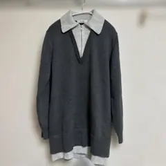 グレーとホワイトのウール100%編み込みセーター、Lサイズ。