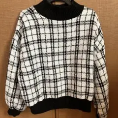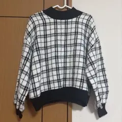 チェック柄の青系ニットセーター、Sサイズ、ボタン付き。