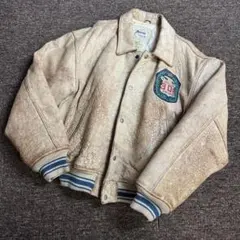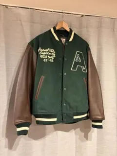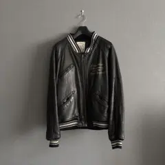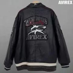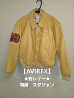 AVIREXのレザー製スタジャン、黒とベージュのコンビネーションで、刺繍ロゴが特徴的。
