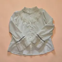 フリルとレースが特徴の薄紫の長袖ブラウス。