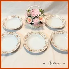 NARUMI製の花柄デザインの皿、金縁仕上げで約27cmのサイズ。5枚セットです。ディナープレートとしてハンバーグやステーキを盛り付けても