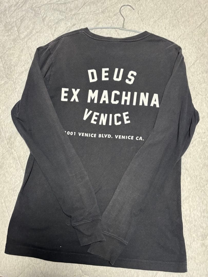 DEUSのロゴが特徴的な黒の長袖シャツ。
