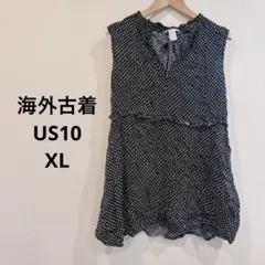 ボタン付きのシンプルな黒のノースリーブチュニック、ゆったりしたシルエットが特徴です。