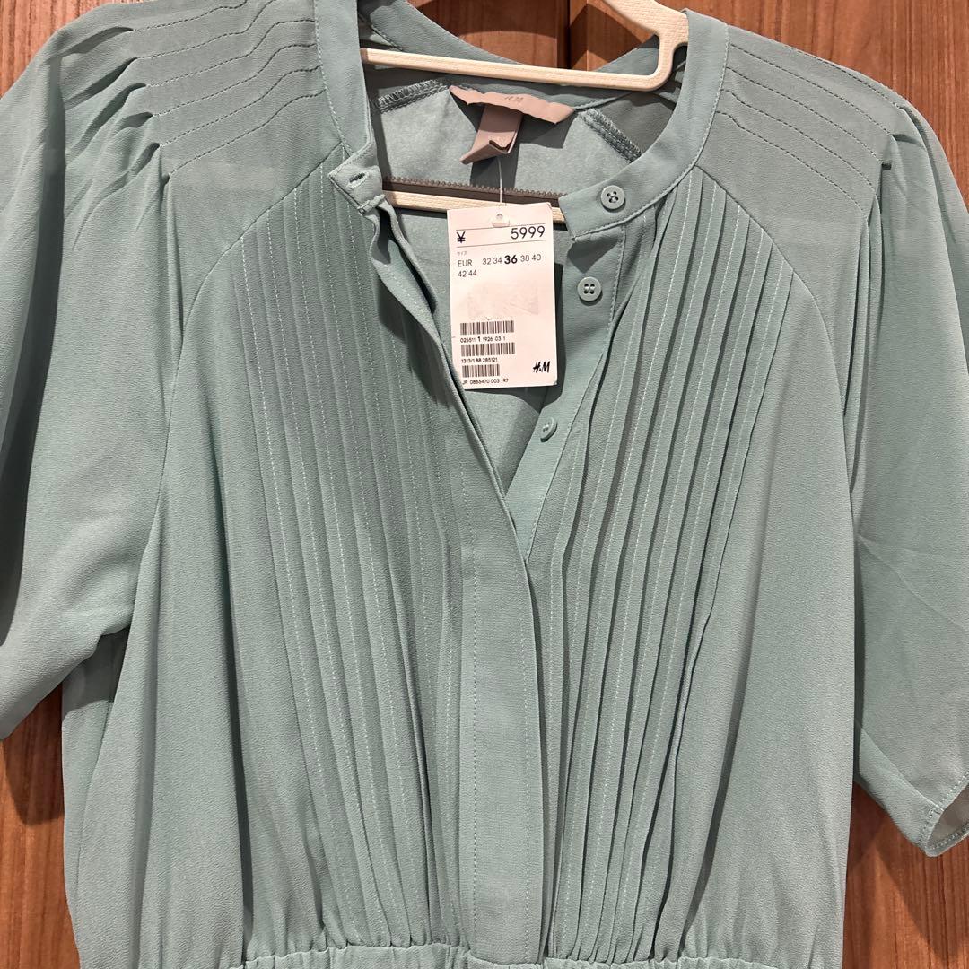 プリーツデザインのミントグリーン半袖ワンピース、H&MのEUR 36サイズ。