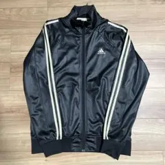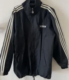 ブラックのadidasナイロンジャケット、ジップアップデザインとサイドストライプが特徴。