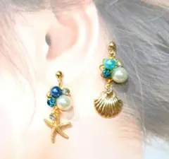 左右で異なるデザインのアシンメトリーピアスです。どちらも可愛い印象で、個性的ながらも上品さがあります。