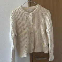 アイボリーの長袖カーディガン、Vネックデザインでボタン付き。