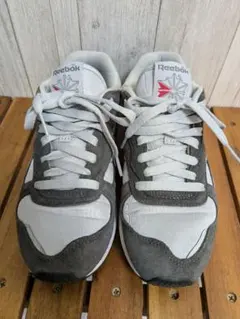 スエード素材のグレーのスリッポンスニーカー、ゴムソール付きで快適な履き心地。