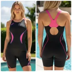 黒と青のストラップ付きスクール水着、ハイカットデザインで快適なフィット感。