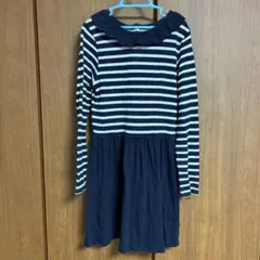 ネイビーと白のストライプデザイン、100%コットン製の長袖ワンピース。