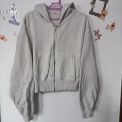フード付きのジップアップパーカー、柔らかいピンク色でカジュアルなスタイルに最適。