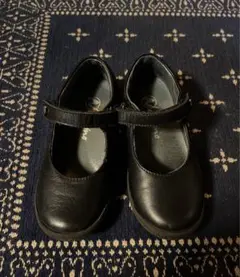 光沢のあるブラックのフォーマルシューズ、リボンとストラップ付きでエレガントなデザイン。
