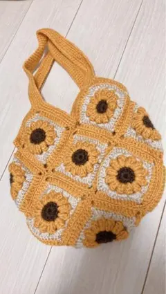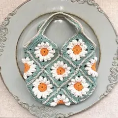 爽やかなグリーンが目を引く、ハンドメイドのかぎ編みバッグです。