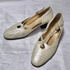 ストラップ付きのアイボリーとオリーブのフラットシューズ、銀座製。