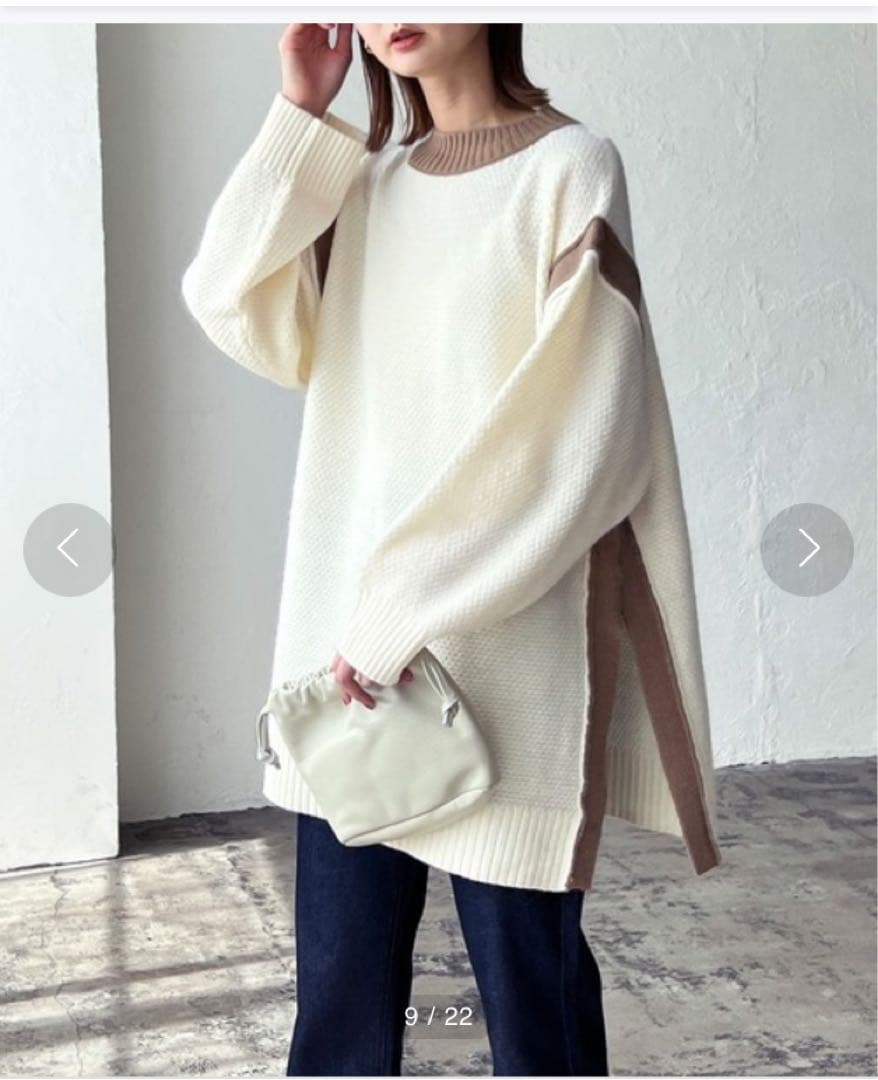デザイン】ネックと袖部分を配色にすることでアクセントの効かせたニット深めのサイドスリットがオーバーサイズにヌケ感を出し、動きのある1枚にドロップショルダーのゆったりとしたシルエットが、抜け感のある着こなしを演出しますぽこぽことした立体的な編地もポイントです