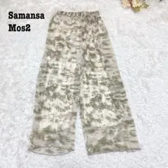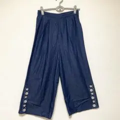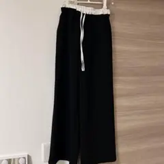 シンプルデザインのセンタープレス入り黒ワイドパンツ、快適なゴムウエスト仕様。