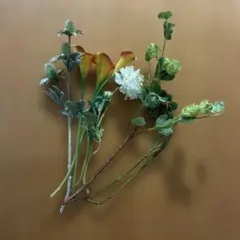 - 使用されている素材: 造花、ドライフラワー