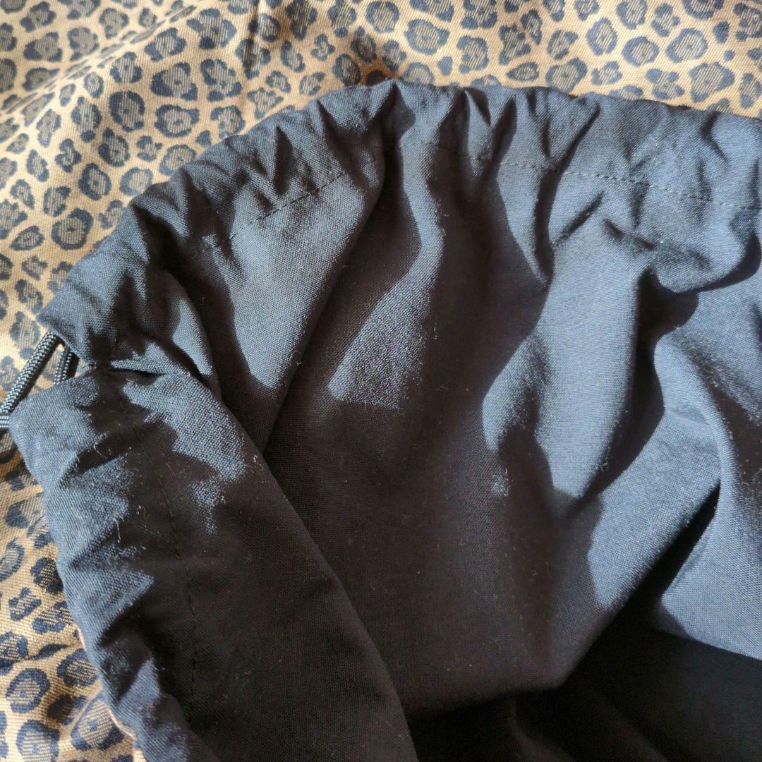 2枚仕立てで、表地は柔らかめのレオパード柄生地、裏地はブラックの撥水加工生地を使っています。張り感のあるしっかりめの生地です。