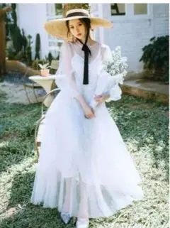 オフショルダーのパフスリーブとリボン付きバックが特徴のホワイトドレス。