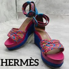 エルメス オープントゥ レザー ウェッジソールサンダル ブラック 美品