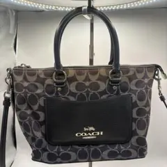 シグネチャーキャンバス地にブラウンヌメ革の組み合わせが特徴のコーチのハンドバッグです。