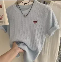 ケーブル編みデザインのグレーの半袖ニット、ゆったりしたフィット感が特徴。