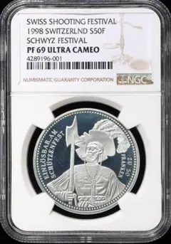 2004年に英仏協商100周年を記念して発行された5ポンドピエフォー銀貨です。英仏協商は1904年にイギリスとフランス共和国が結んだ協定で植民地支配による衝突を妥協させる目的がありました。 コインのうらには友好を記念し、1904年の年号、両国の女神ブリタニア(イギリス)とマリアンヌ(フランス)の胸像が 一枚のコイン内にデザインされています。 この銀貨は希少性が高く、NGC鑑定済みコインは世界で12枚しか存在しません。