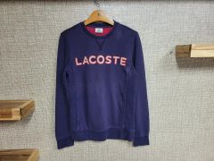 Lacosteの刺繍ロゴが施されたホワイトの長袖トレーナー。