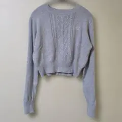 フワフワのグレーのVネックニット、リボン付きでバルーンスリーブデザイン。