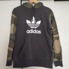 迷彩柄のadidasフード付きパーカー、カンガルーポケット付き。
