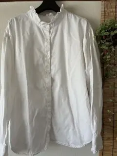 薄手のベージュの長袖シャツ、ボタン付きでポケットあり。