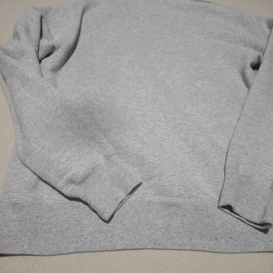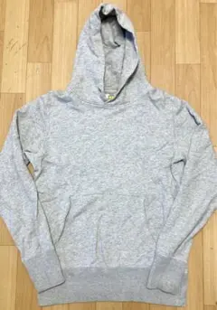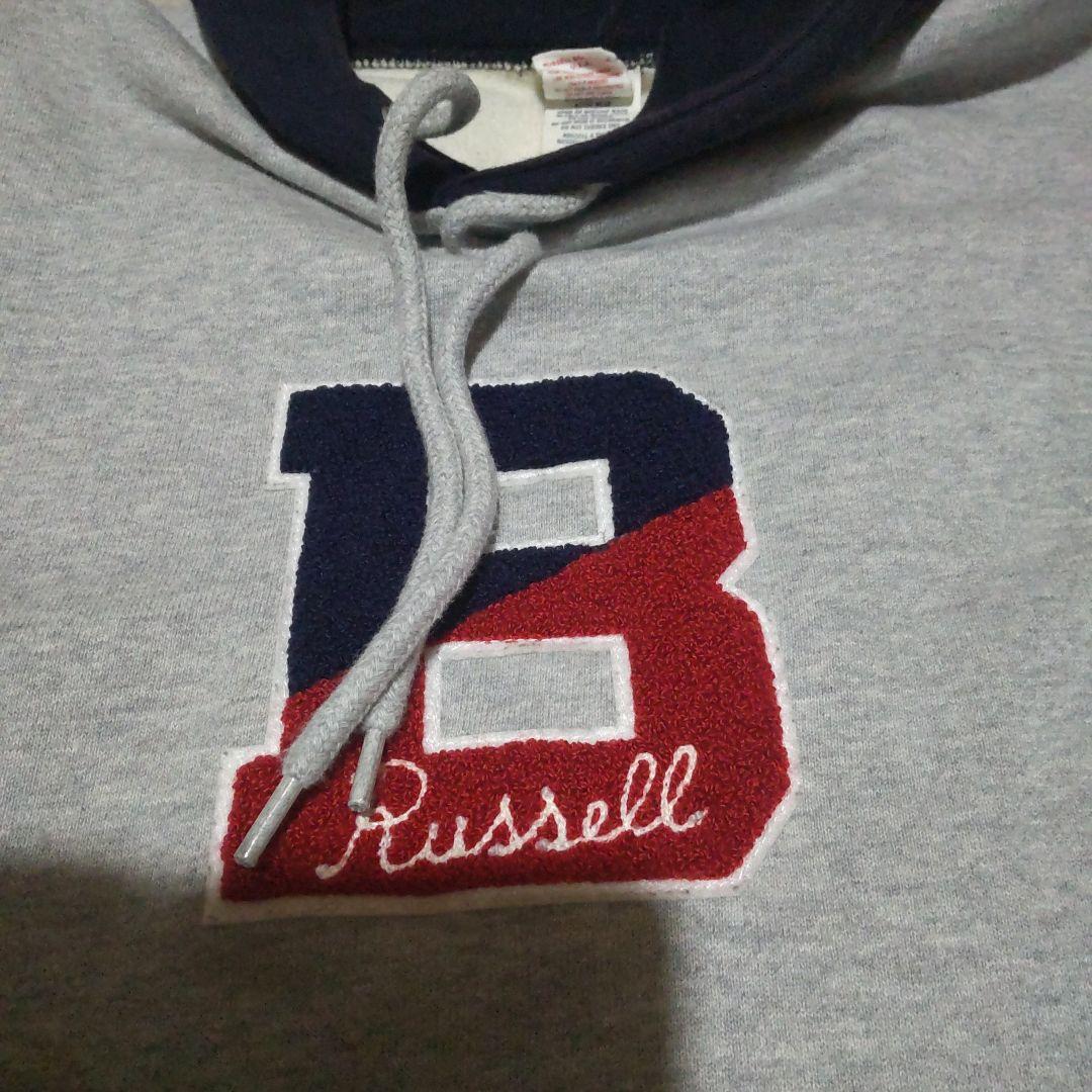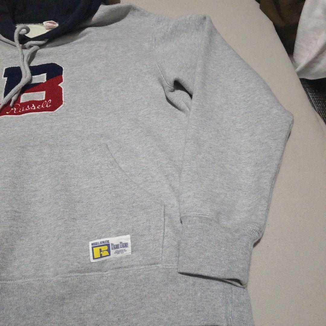 グレーのフーディ、Russell Athleticのロゴ付き、カジュアルスタイル。