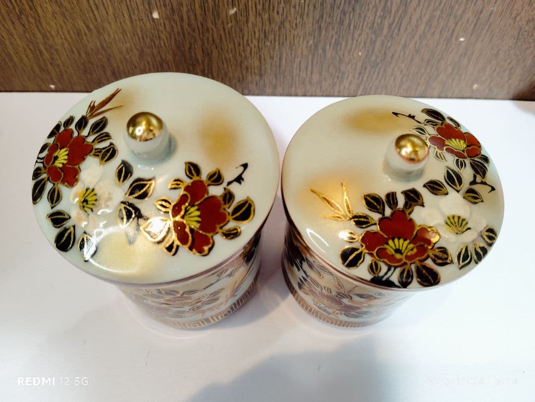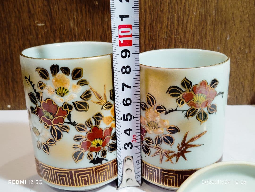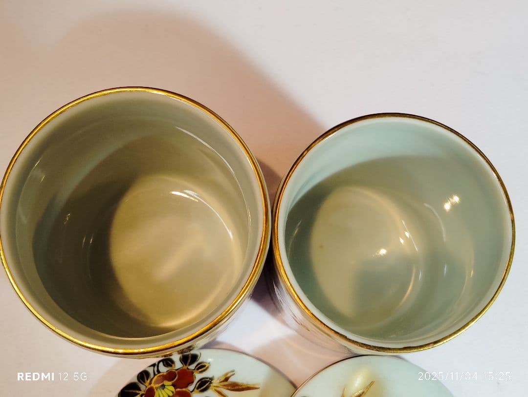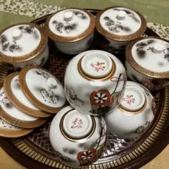 九谷の五彩を用い優雅な画風のお品です。金彩がふんだんに施されていて大変高級感のある組湯呑みです。
