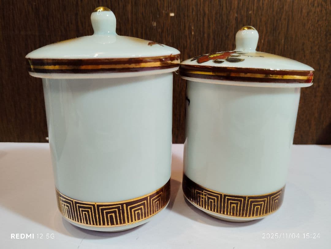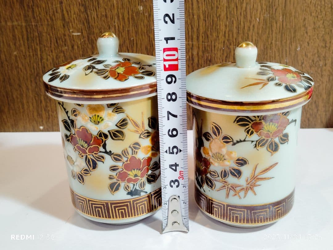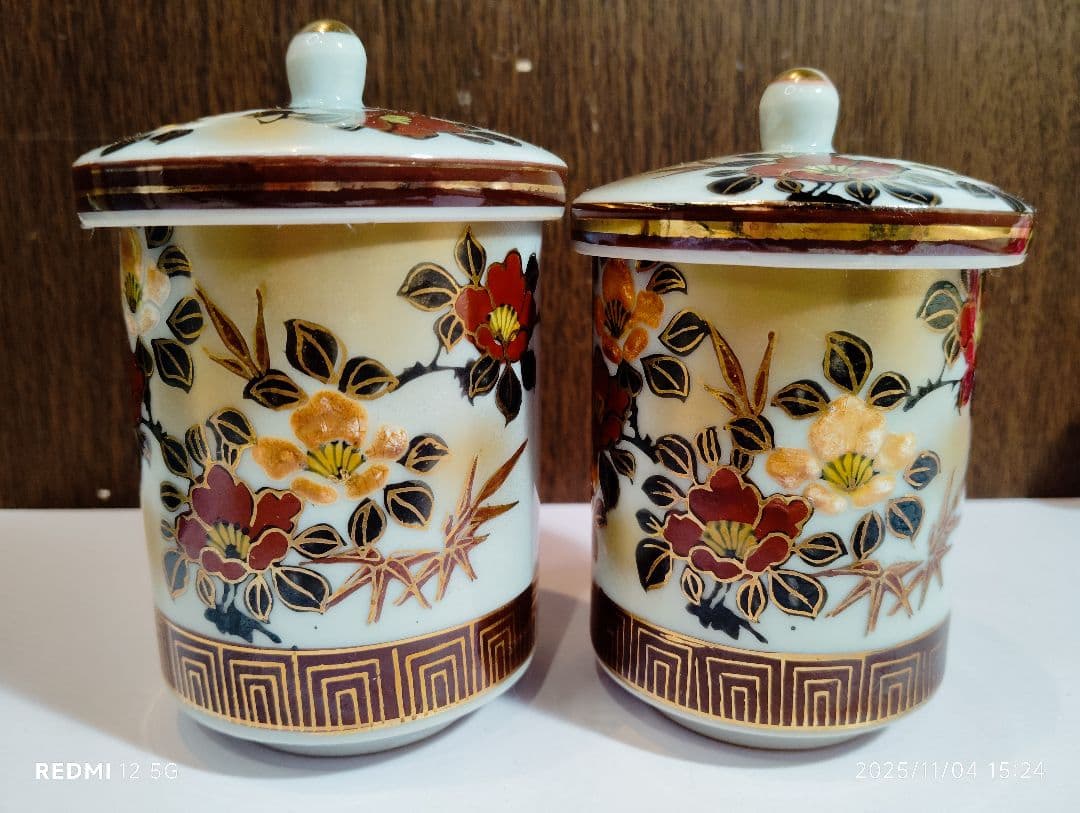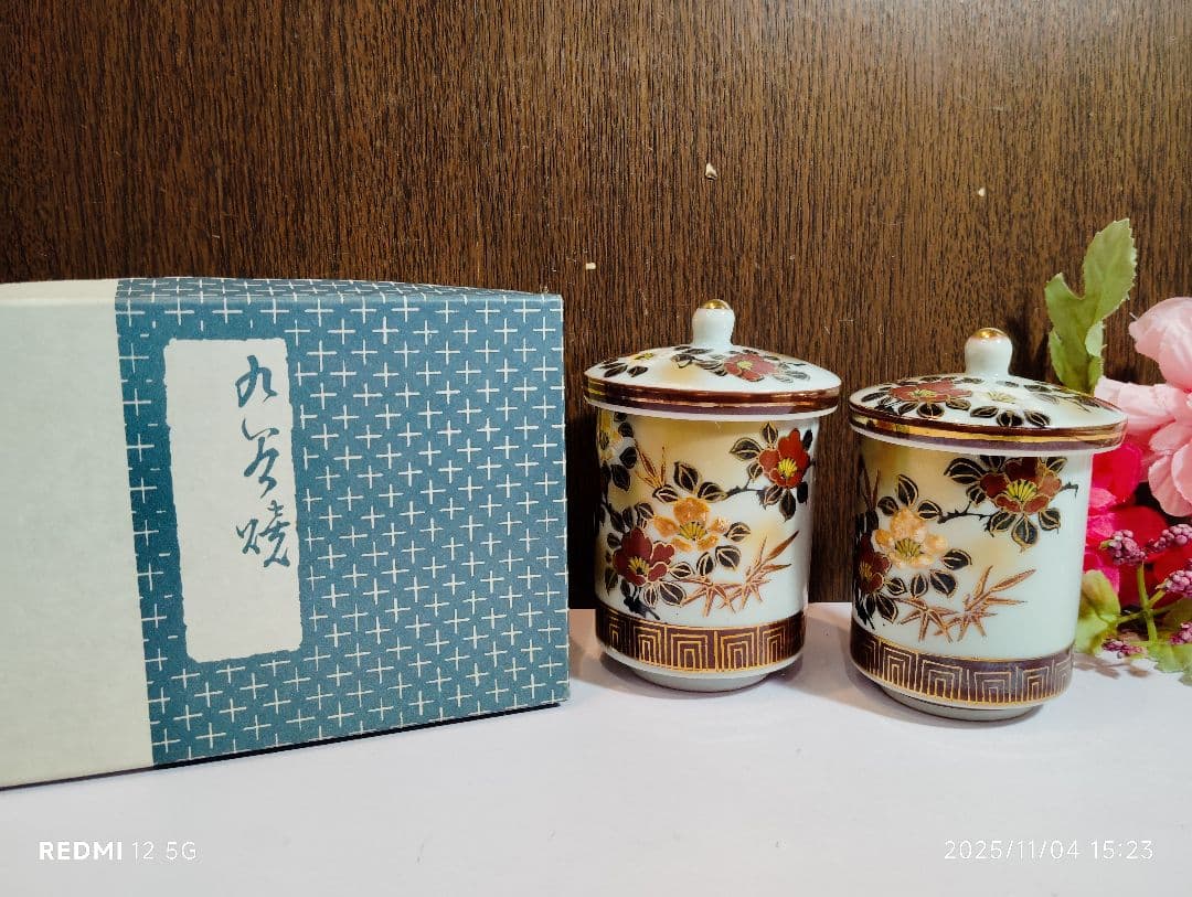 九谷の五彩を用い優雅な画風のお品です。金彩がふんだんに施されていて大変高級感のある組湯呑みです。