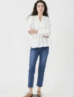 グレーのストレートデニム、5ポケットデザインで、シェービングダメージ加工が施されています。