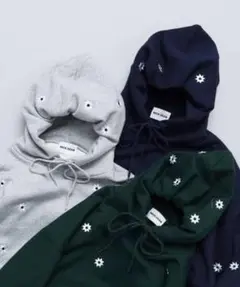 グレーのスウェット生地に星型の刺繍が施されたフード付きパーカー。