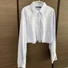 カジュアルな黒のクロップドシャツ、前面に2つのポケット付き。