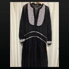 ボリュームのある袖(ボリュームスリーブ)と、足首まで隠れるマキシ丈のシルエット。
