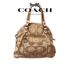 アイボリーとベージュのストライプデザインのCOACHハンドバッグ。