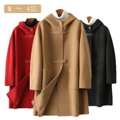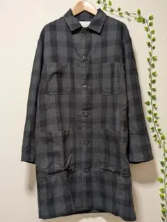 オリーブ色のボタン付きロングコート、前面にポケット付き。
