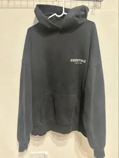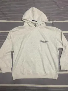 ベージュのESSENTIALSパーカー、Lサイズ、ロゴ刺繍入り。