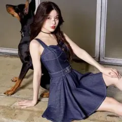 水色のデニム風ノースリーブミニワンピース、ベルト付きでスタイリッシュな印象。