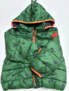 恐竜柄のグリーンアウター、フード付きで暖かい。