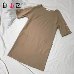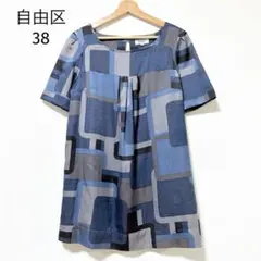 ★美品★ 自由区 ワンピース ひざ丈 スクエアネック 総柄デザイン コットン素材