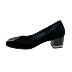 Tory Burchのブラックロゴ付きフラットパンプス、ヒール約5cmで快適な履き心地。