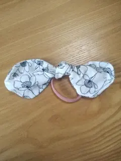 華やかな花柄のリボンヘアゴム、約10cmのサイズで可愛らしさを演出。