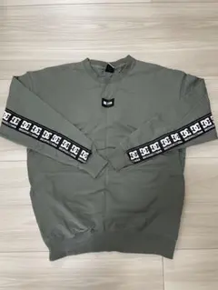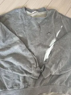 ダメージ加工が特徴のホワイトトレーナー、OVERSEASのロゴ入り。