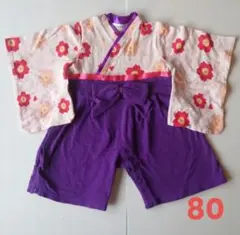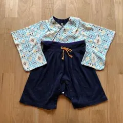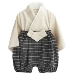 羽織袴ロンパースです。黒とストライプのデザイン、金色の刺繍と房飾り付き。
