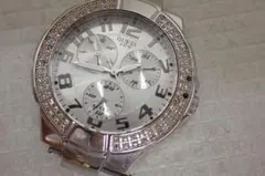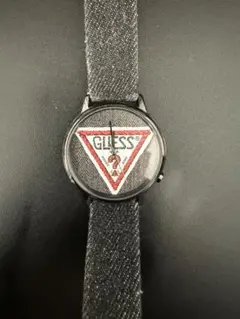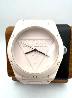 編み込みレザーのストラップと三角形の文字盤が特徴のGUESS腕時計。