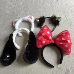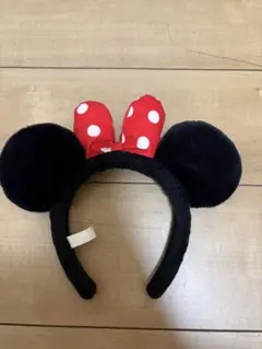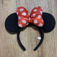 ミニーマウスのデザインが特徴的な赤い水玉のカチューシャ。